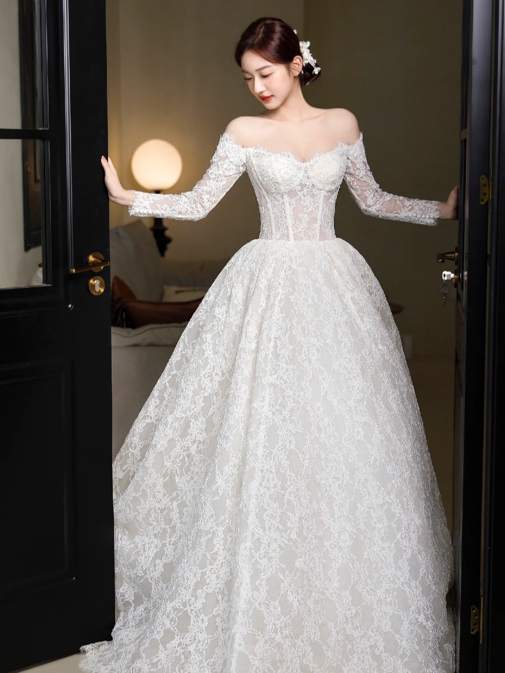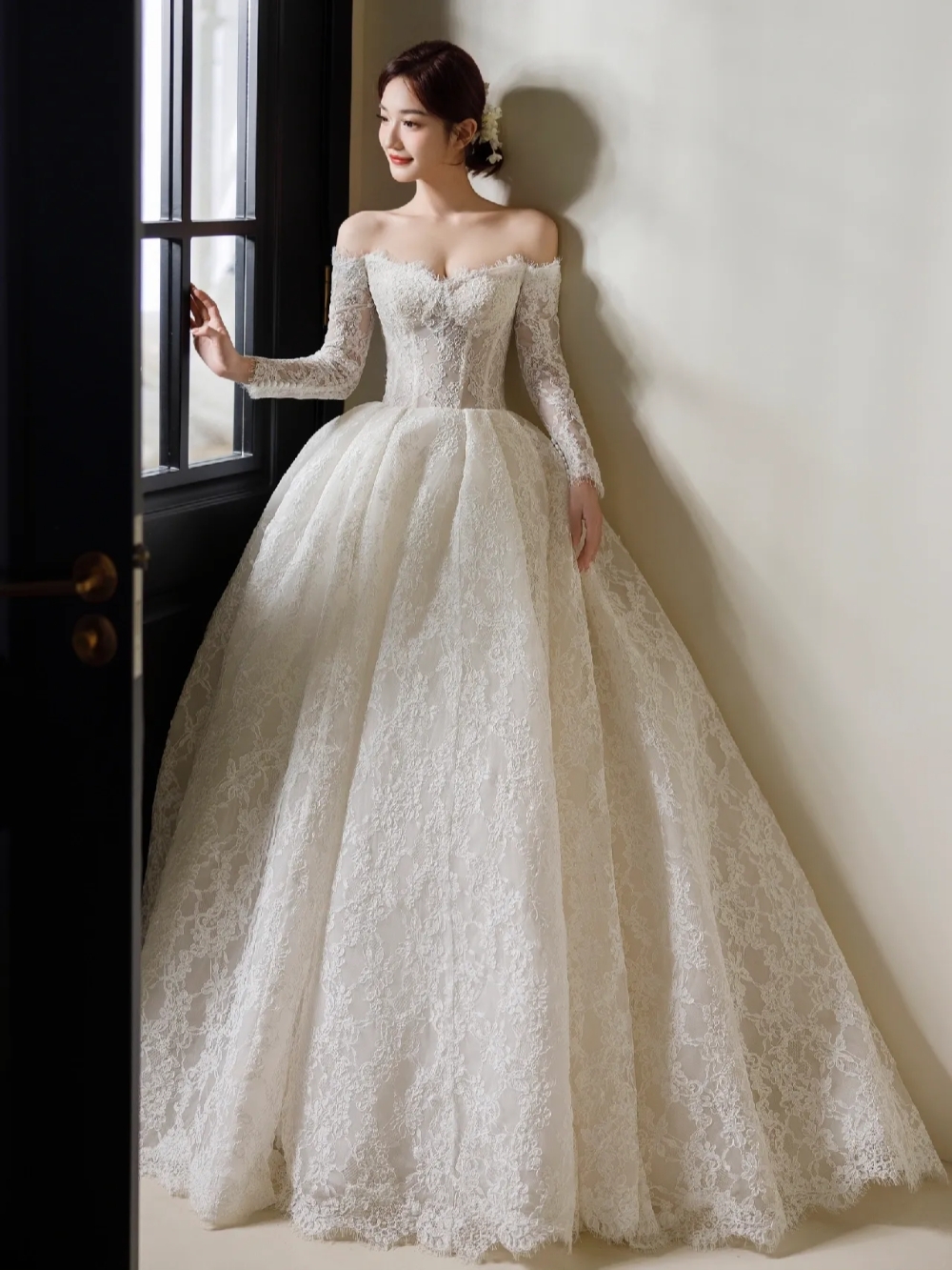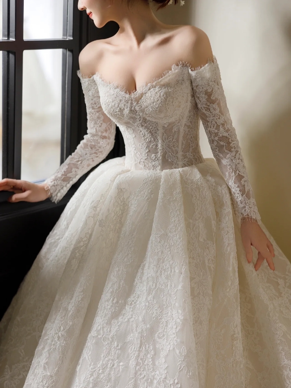 蕾丝一字肩长袖婚纱